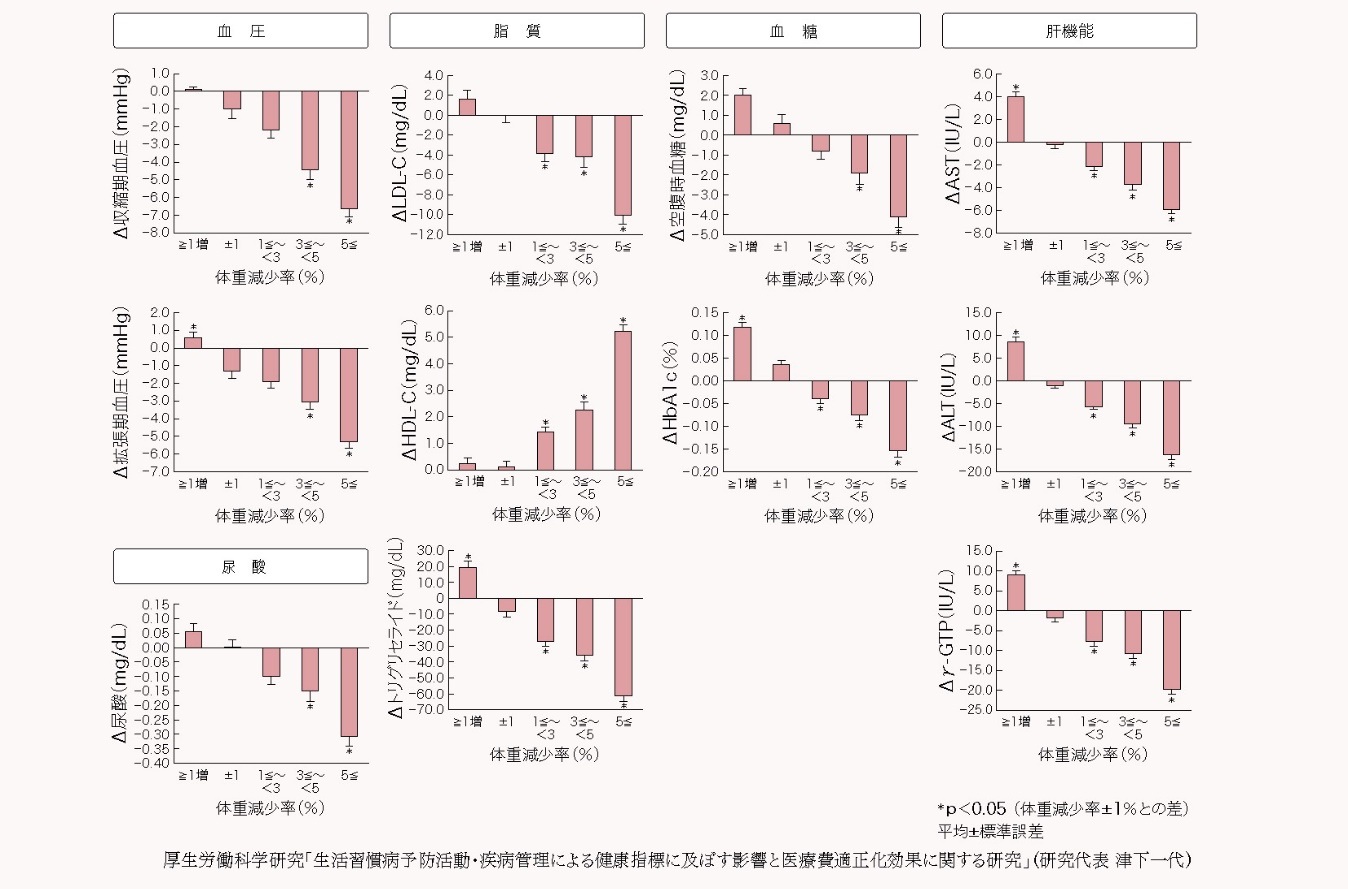体重減少率が大きくなるほど、血糖、血圧、脂質だけでなく、肝機能、尿酸値の改善がみられること、多くの検査項目で3~5%の減量により有意な改善を認めることがわかりました。3%以上の減量達成率は特定保健指導参加者の約3割程度であり、実現可能な目標ではないかと考えられました。